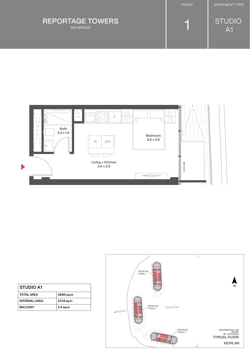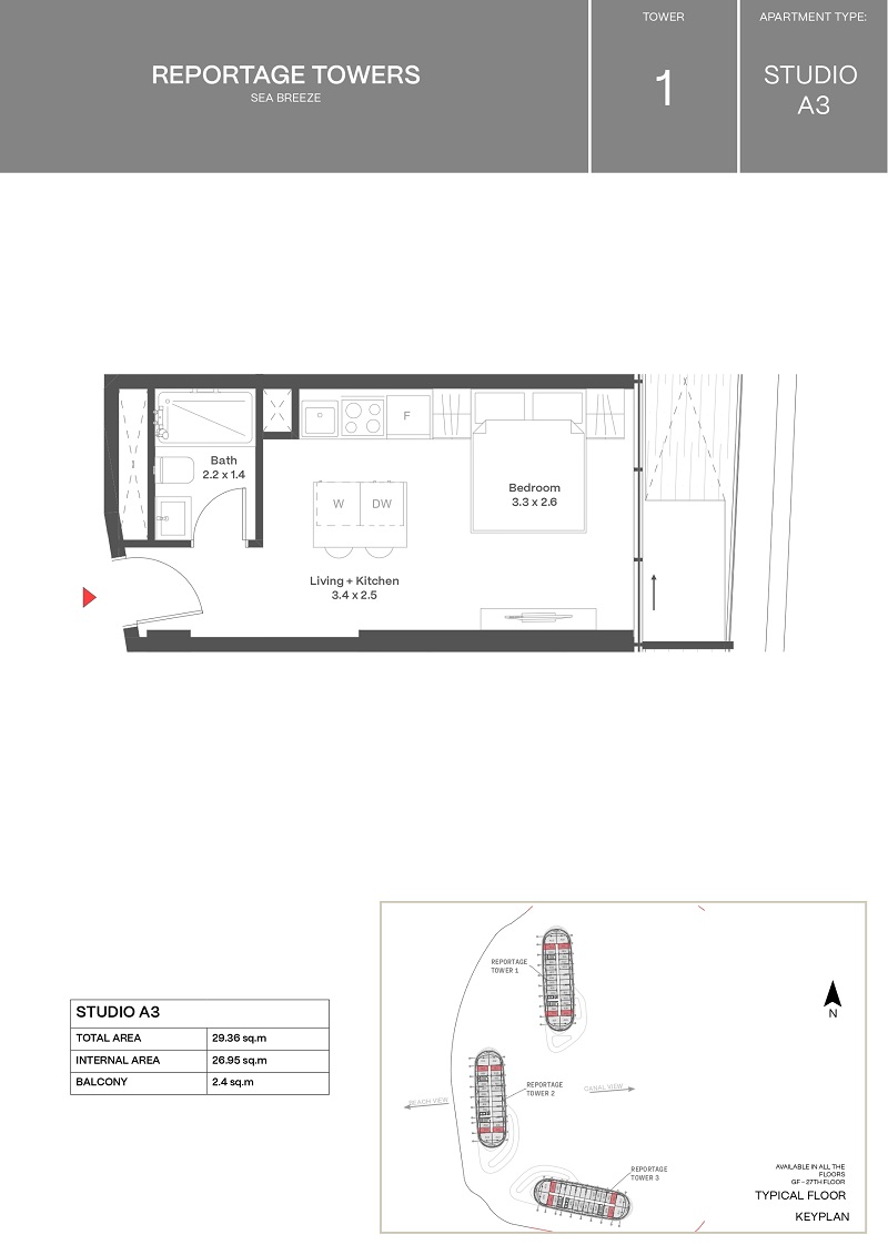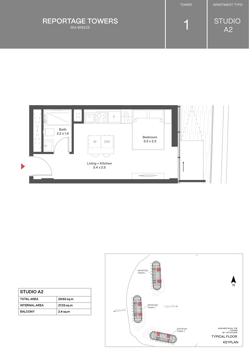 Sea Breeze ərazisində Reportage Heights kompleksində studiya mənzil satılır, 28 mərtəbəli Reportage Tower 1 binasının 4-cü mərtəbəsi. Ümumi sahə 29,37...